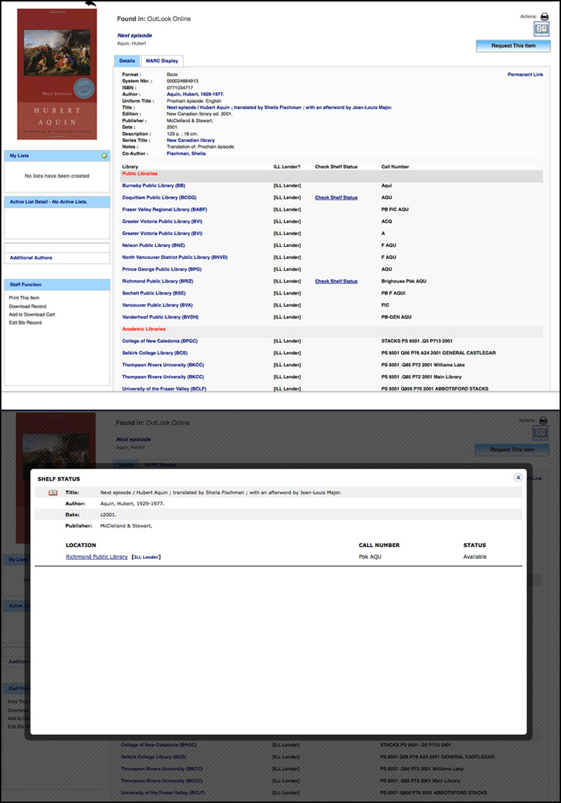 The Illume Administrative Support Centre will work together with you to activate Live Shelf Status. To double-check if it has been activated for your library you can check your records found in the BC Union Catalogue (formerly OutLook Online) union database instead (example below). If you have a hyperlinked "Check Shelf Status" link available next to your Library name - then you have Live Shelf Status activated! For example only Coquitlam Public Library (BCOQ) and Richmond Public Library (BRIZ) have Live Shelf Status activated below. Click on a "Check Shelf Status" link to see the availability of that item.