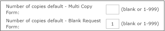 - Blank Request Form: Enter the number "1" next to "Number of copies default - Blank Request Form" if you allow Patrons to use the Blank Request Form or your Staff frequently uses the blank request form to create single requests.