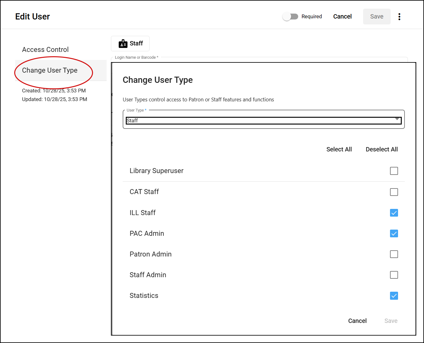 - Change User Type tab: Click the "Change User Type" tab to add one or more broad module permissions such as ILL Staff [Admin], Pac Admin, or Statistics. Don't forget to click "Save" confirm your changes after checking-off your desired user types. Check-out the user type descriptions and tips below or contact us for further assistance.