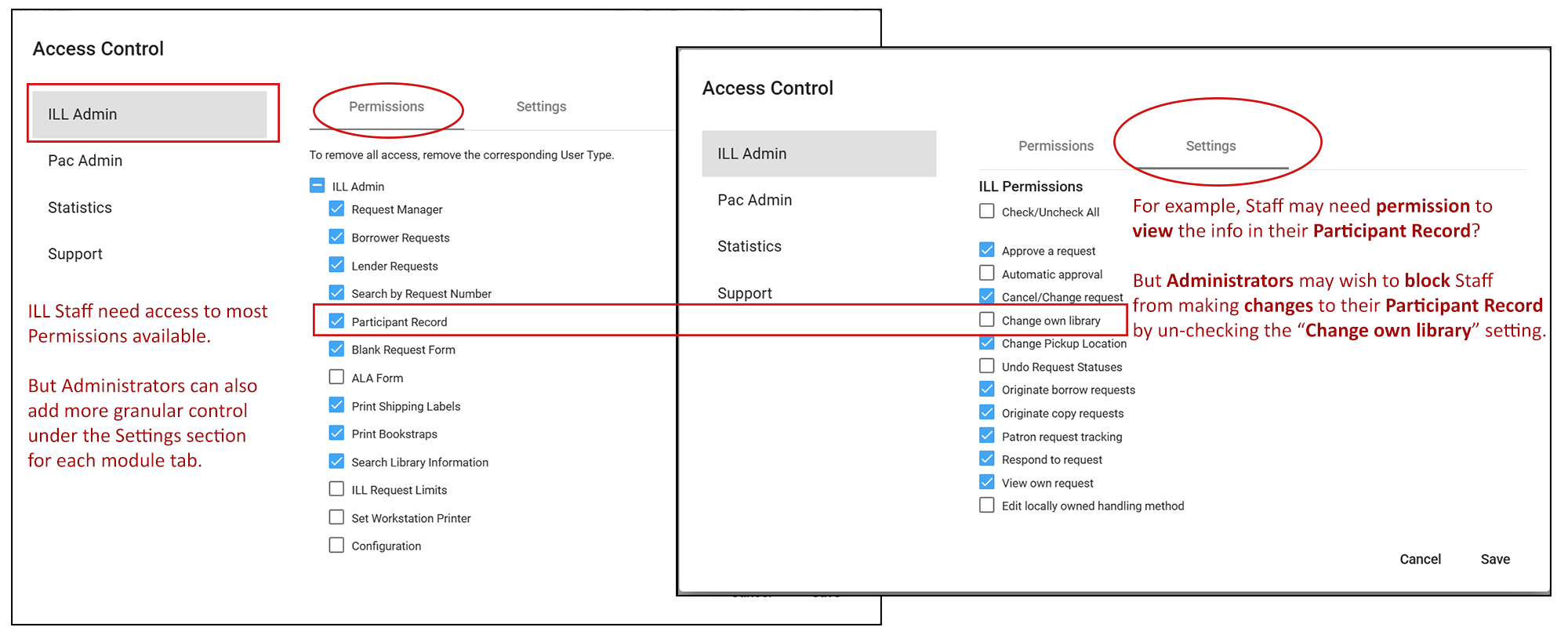 ILL Staff: This user type adds the ILL Admin module and is recommended for ILL Staff using the Request Manager and for Circ/Refdesk Staff using the ILL Admin > Borrower/Lender Requests or Search by Request Number lookups.