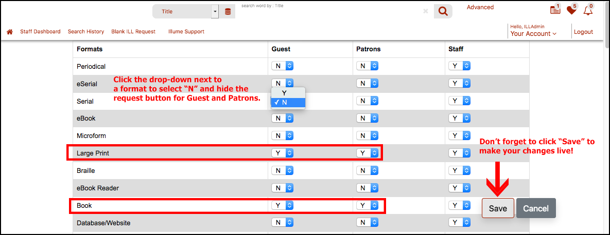 If your library ILL policy only allows for patrons to request "Books" select "N" from the drop-down next to every format except "Book" and "Large Print" for Guest & Patrons.
