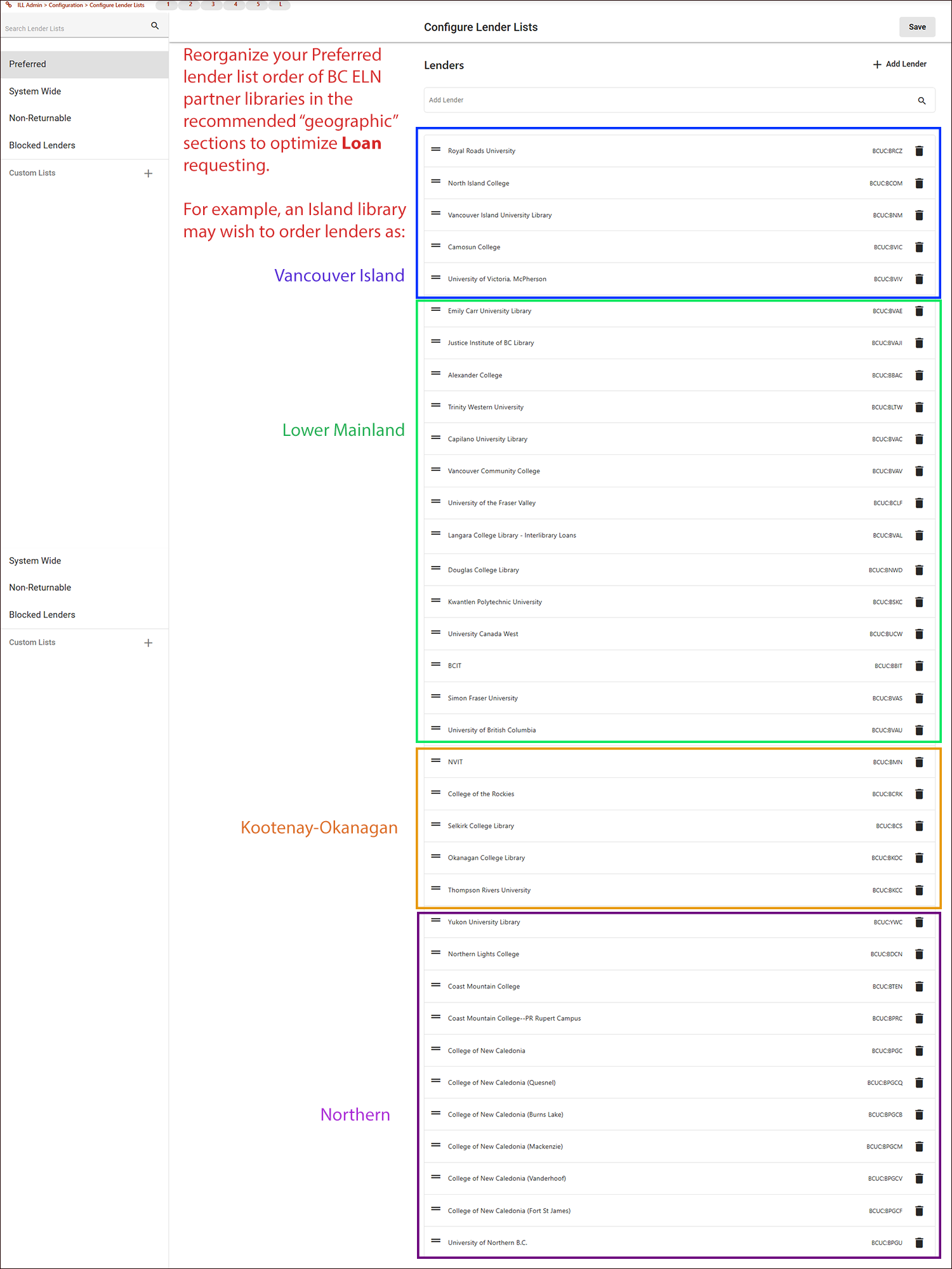 4. In the Lenders section, organize the institutions for your four (4) recommended geographic sections from closest-to-furthest as desired. For example, Vancouver Island post-secondary libraries may wish to order their sections as Vancouver Island, Lower Mainland, Kootenay-Okanagan, and Northern.